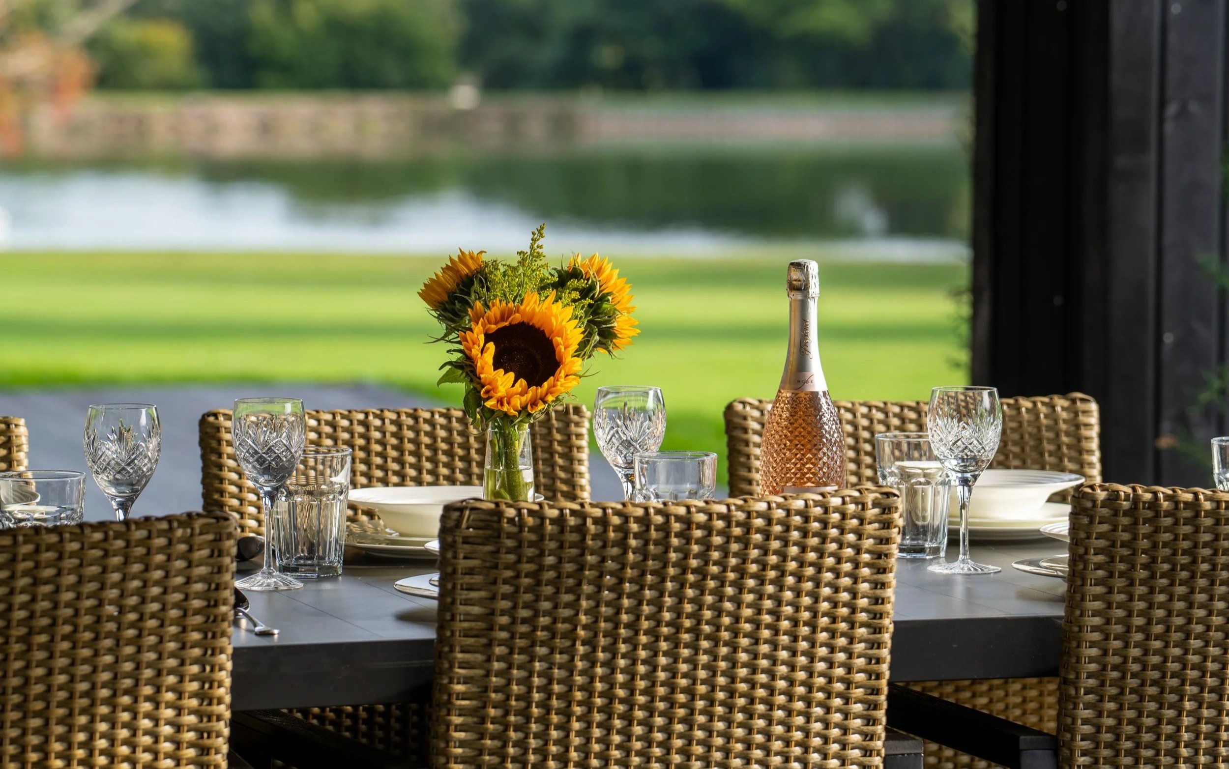 The principal function room can accommodate up to 40 seated guests and offers floor-to-ceiling sliding door glazing on two sides that capture the light and uninterrupted views across the lake, while remaining fully enclosed and comfortable whatever the weather.